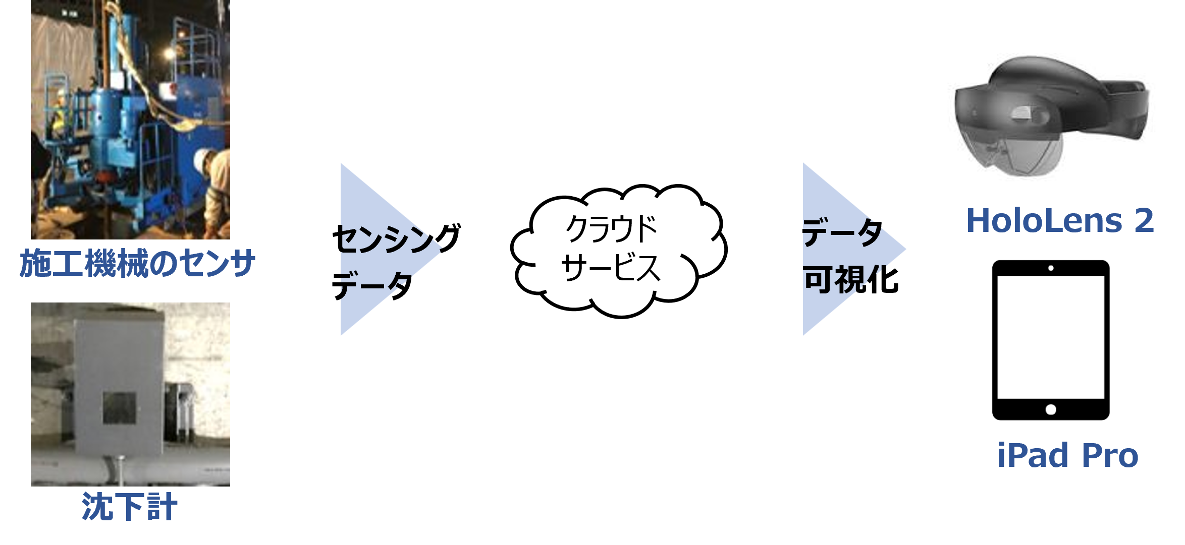 施工機械に設置したセンサおよび施工箇所周辺に設置した沈下計から、クラウド経由で施工深度・鉛直変位量の情報を取得します。そのデータをもとに、HoloLens2やiPad Proを用いて、施工位置と進捗、沈下計の計測結果を現場空間にリアルタイムに重ね合わせて可視化します。