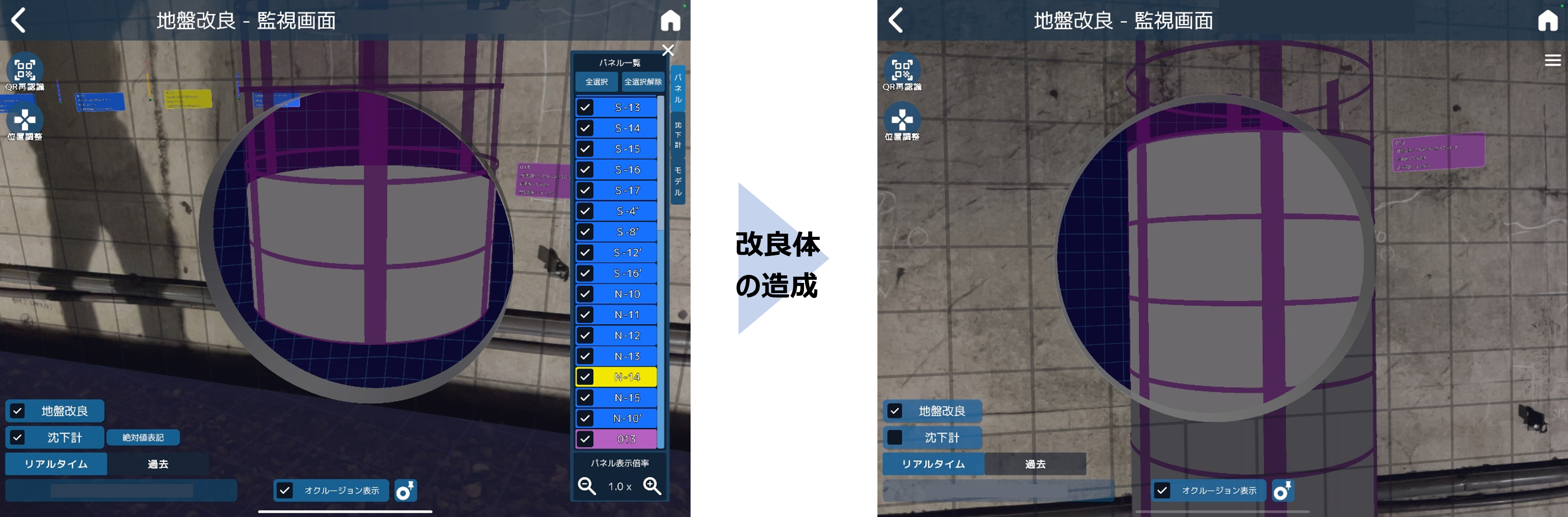 地盤改良工の施工位置は、円柱状の三次元モデルで表示され、施工進捗にあわせて着色部(グレー)が増加します。沈下計の計測結果は、沈下計設置場所にシリンダー状の三次元モデルで表示され、計測結果に合わせて高さが変化します。