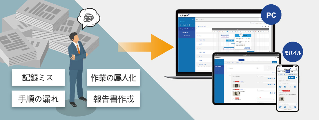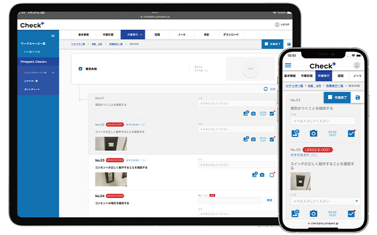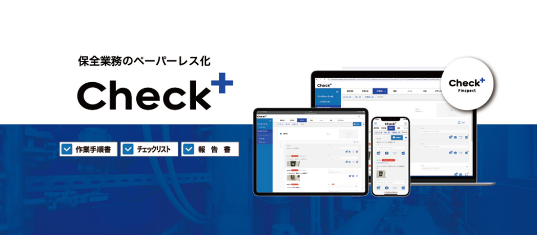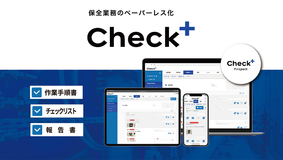Check+は、作業手順・チェックリストをノーコードでデジタル化し、Webブラウザとモバイル端末で作業・記録を行えるクラウドサービスです。