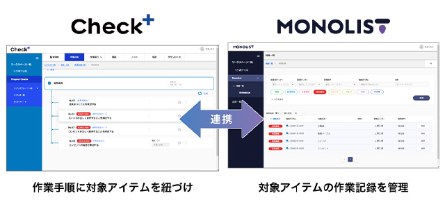 MONOLISTで管理している設備・機器・損傷などの情報(アイテム)とCheck+を連携し、位置情報と紐づいた作業手順書を作成することができます。