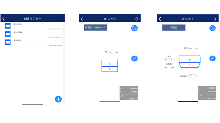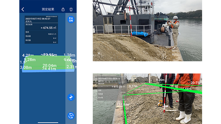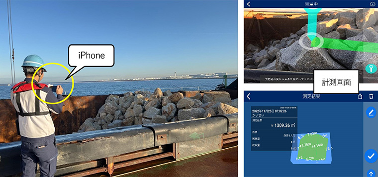 計測が終了すると、船倉部分の積載量と、計測した部分の体積を加算した結果が自動で算出・表示されます。