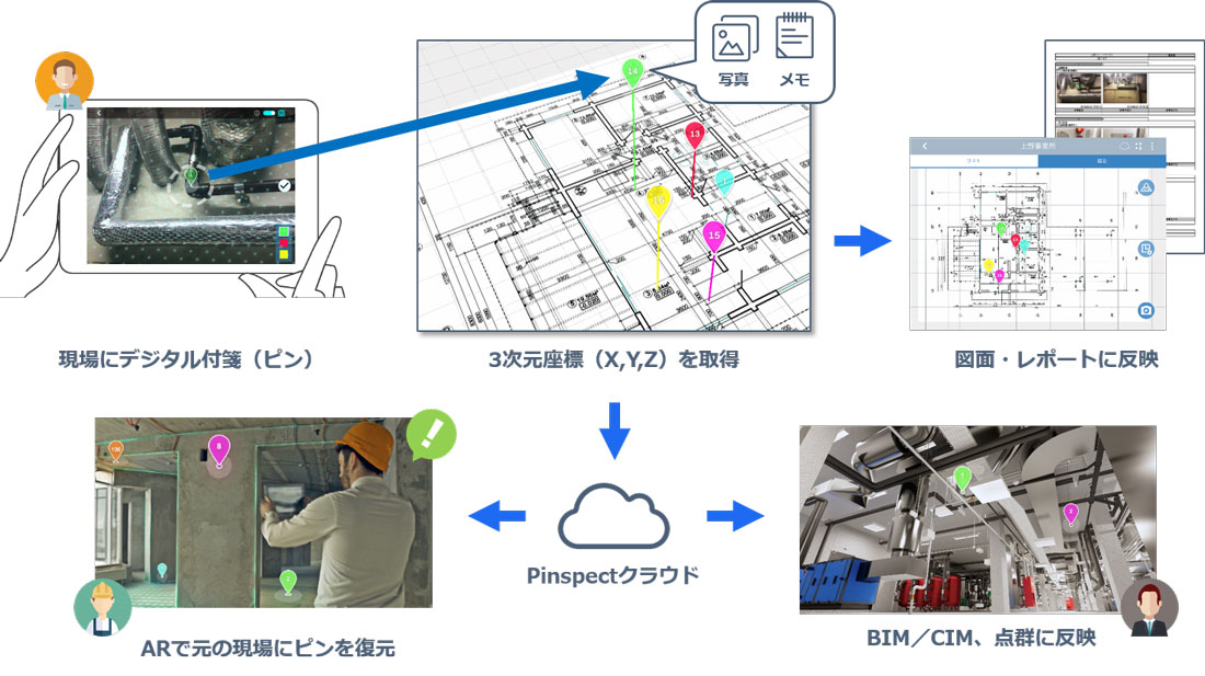 検査・点検箇所の3次元座標を取得し、デジタル付箋(ピン)として現場の空間上に可視化。