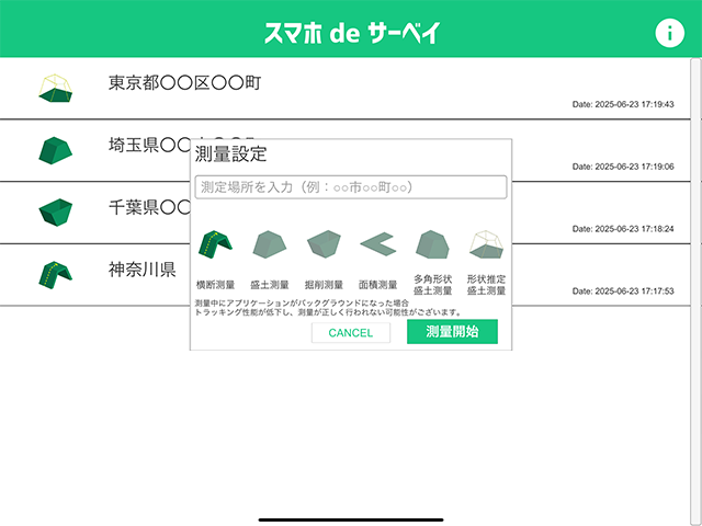 ※多角形状盛土測量と形状推定盛土測量の利用には、別途アプリ内課金が必要です。