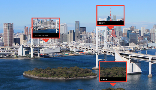 情報を合成表示GPS情報や、周辺の環境情報から自己位置を推定し、周辺のスポット情報をカメラ上にタグとして、合成表示します。