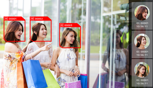 カメラ内に映った人物の顔情報から、事前に登録しておいた顔のパターンデータとのマッチングや、属性(性別、年代、表情)などの情報を判別が可能です。